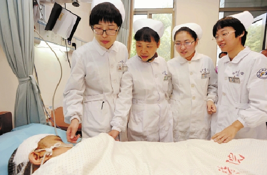 四位“最美护士”朱小芳、陈峰敏、奚彩芬和寿晓霞在病房探望已脱离生命危险的高金昌。本报记者 董旭明 本报通讯员 尹炳炎 摄