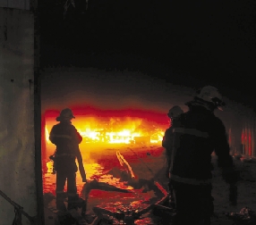 10月30日,仓库着火时,消防战士冒险灭火。 章一立/摄
