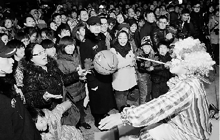 昨天,杭城某商场在户外广场举办跨年派对,小丑与市民展开热情互动,共贺新年到来。