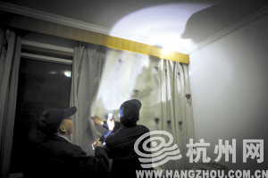 前天晚上,两位专业人员打着手电筒在沈先生家找蝙蝠。记者 朱丹阳 摄