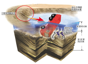 多次努力后,潜水员最终确定坠湖工程车的准确位置,但是车辆侧翻入湖后呈底朝天状态,驾驶室位置已经全部陷入湖底淤泥(淤泥深约20米),一时无法施救。