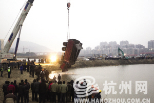 昨天17:20,20吨工程车被400吨吊车打捞出湖。记者 朱丹阳 摄
