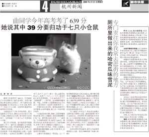 2006年8月31日,快报做了关于小曲的连续报道《曲同学今年高考考了639分 她说其中39分要归功于七只小仓鼠》。