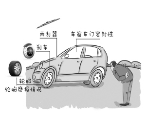 胎压、轮胎磨损情况、雨刮器、刹车是否正常