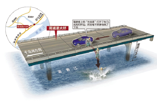 昨天早上7点10分左右,冷雨淅沥。杭新景高速上,一辆开往千岛湖方向蓝色福特轿车,突然停靠在高速周浦港大桥的硬路肩上,大桥的正下方是湍急的富春江。车子停靠后,驾驶座上的“光头男”打开了车门,走到栏杆边,毫不犹豫地纵身一跳,他的身影在空中划出了一条曲线后,消失在了冰冷的江水之中。