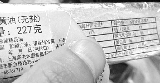 洪先生说,黄油中钠含量小于5毫克/100克时,可称为“无盐”,照此换算,这块227克的“无盐”黄油钠含量不应超过12毫克。