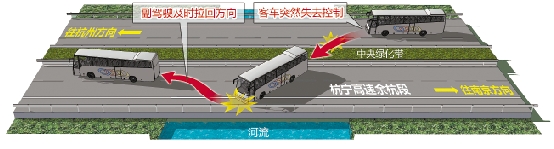 杭宁高速上,一辆急驶的大客车突然越过绿化带,冲到对向车道,一头撞上了边护墙,下方就是一条河。幸亏,坐在后面休息的副驾驶员冲上前来,一把把正了方向。“真是命悬一线啊!”乘客们心有余悸,差点就翻下河去了,还险些和对向车道迎面而来的重型货车撞上,真的差点就出大事了。