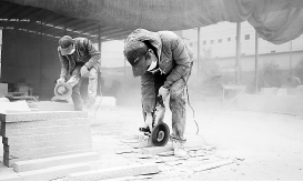 石材加工厂的工人正在切割石料。