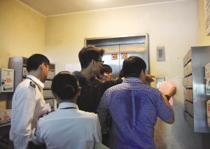 昨天下午,质监工作人员在都市枫林停运电梯,几趟下来汗流浃背。 记者 江玥 摄