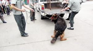 4个城管在巨犬四周,用长臂捕狗铁套,将它慢慢拉进铁笼。巨犬还一度狠咬链条,试图挣脱。