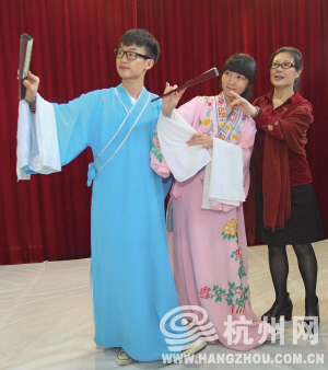 表演者是浙江工商大学星光戏剧社的两位同学,他们都是90后大一新生,“梁山伯”学的是广告,“祝英台”学的是工商管理。两个人穿着戏服,正在排练唱段中走步、扑蝶、收扇等基本动作。