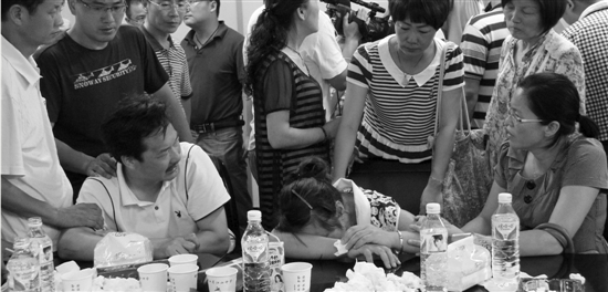 昨天,在江山中学,揪心的家长们一起互相安慰。 葛跃进 摄