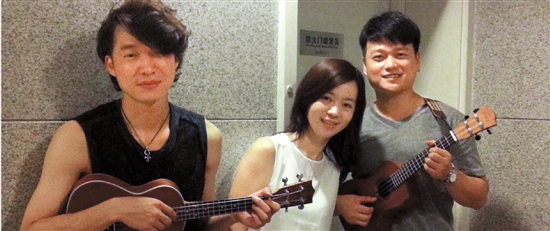 两位帅哥手里抱着的就是“ukulele”,优克粒粒琴,意为“跳跃的跳蚤”,一种四弦吉他,发源地是夏威夷。看上去,就是一把迷你吉他,长相很萌,有种“天然呆”的气质。乐队成员说,这并不难学。但是不要忽视他们三个都有音乐基础,请不要盲目购买。记者 杨茜/摄