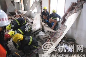 事发地点是一幢三层楼砖瓦结构的房子,出事位置在房屋二楼。消防队员赶到现场时,看到大量坍塌的石块、预制板、水泥全部堆积在了一楼位置。同时二楼楼层局部已被塌穿。