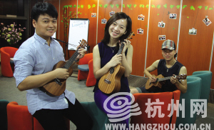 三人就这样碰到了一起。因为办公楼里不适合吉他、架子鼓这些声音较大的乐器,三人于是开始玩起最近比较流行的轻型乐器——尤克里里,类似一种缩小版的吉他。