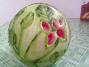 读者周秀芳女士花了两天零4个小时心血,直到前天凌晨1点,才完成了两件爱心西瓜雕刻作品,送给老公做七夕礼物。