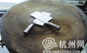 店里有两块砧板,小一些的用来切肉,大砧板专门剁肉。这块大砧板,是很厚实的圆木墩,上面摆了两把银色钢刀。有一把用久了,看起来刀柄应该断过一次,后来又重新焊上,留下了黑乎乎的一截。