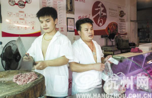 聊了三四分钟,刚刚那一块大约一斤重的夹心肉,就成了砧板上一摊红白相间的肉末。陆天培估摸了一下,剁一斤肉,至少左右挥刀200多次(也有人把手工剁肉称为“千刀肉”,但从小陆的实际经验看,用不了一千刀)。现在每天店里卖出去的肉里,要剁的一天最少六七十斤,这么算的话,每天至少要挥刀10000次。
