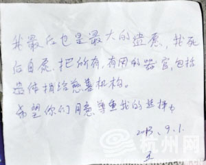 “警察同志,你好!我决定我死后把自己的遗体和所有器官都捐献给慈善机构。请你们赶紧帮忙联系医院。我在良渚××村。当你们收到短信我已不在了。谢谢!麻烦你们了!”