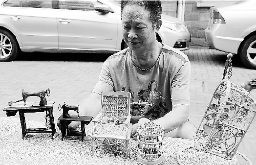杭州江干区景芳二区有个民间手工艺高人叫沈秋发,今年67岁,善于制作各种木制手工艺品,这些手工艺品都是用一些废弃的木料和藤条做的,也算是一位环保达人。瞧,木制的吊篮、鸟笼、藤椅、缝纫机……惟妙惟肖。 连国庆 摄