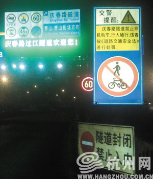 庆春隧道口的警示牌注明禁止非机动车和行人通行 记者 董吕平 摄