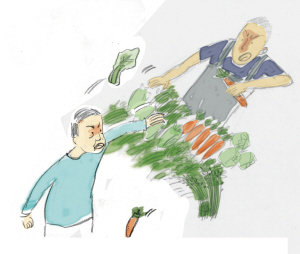 两个人就这样互相扔着蔬菜,然后很快扭打在一起。