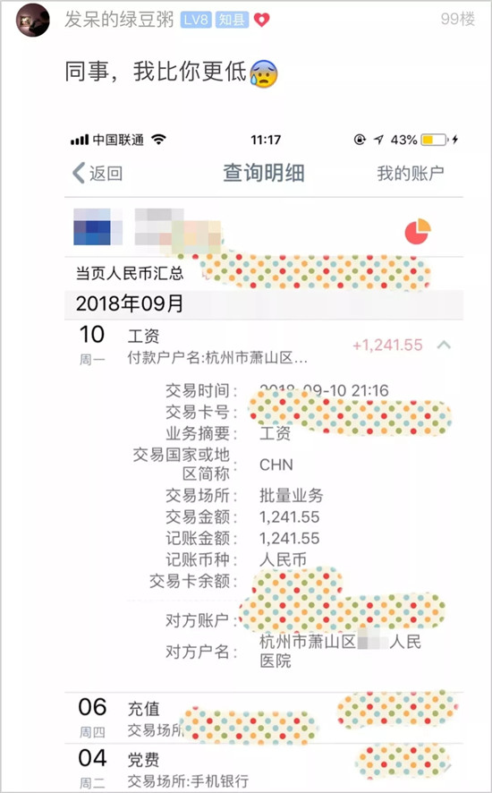 网友「发呆的绿豆粥」同样在医院上班,他9月的工资到手1241.55元。