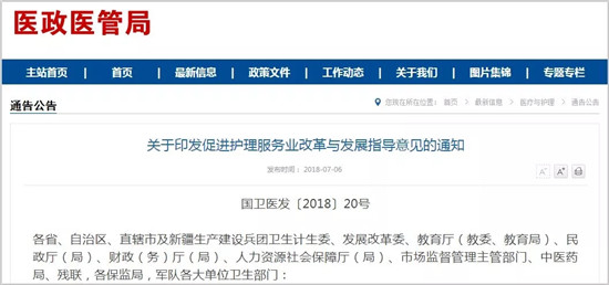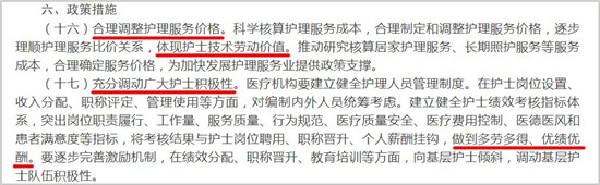 今年7月,国家卫生健康委员会官网公布了《关于印发促进护理服务业改革与发展指导意见的通知》,其中提到,将合理调整护理服务价格,体现护士技术劳动价值,并充分调动广大护士积极性。
