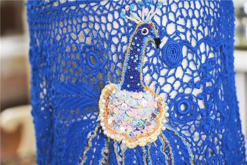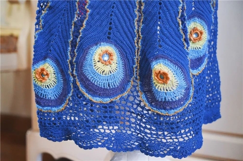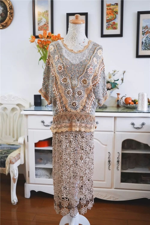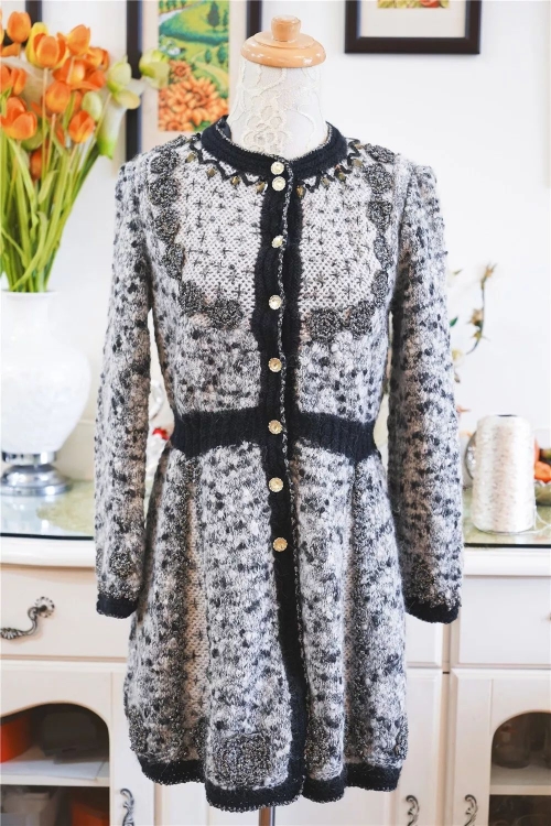 几十年身材保持不变,卓阿姨给自己编衣服都不用尺子量,一次性做下来没有不合身的。我观察了她的作品,除了传统的中式,还有编织版的小洋装,它们共同的特点是也许拿在手里挺平常的,可一穿上就整个发亮了。