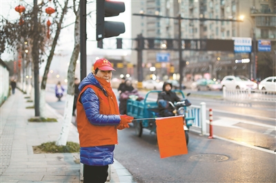 路口有点冷,曹云妹把羽绒服的风帽收紧,又把棉手套戴上。红灯了,她挥挥旗子,一排电动车缓缓停在白线后面。