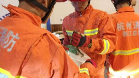 5月22日晚上22时34分,富阳消防分指挥中心接到报警称:位于富阳区大源亭山东路97号的火锅店里有一条蛇,严重影响店主与消费者的安全。接到报警后,春江中队立即派出一辆抢险救援车7名队员前往处置。