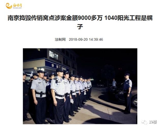 对此,志玲也查询了该事件的相关新闻。据了解,今年5月份,南京市公安局江北新区民警在日常工作中,获悉线索有人在辖区从事传销违法活动,江北新区分局迅速抽调精干警力成立专案组,会同浦口分局开展调查,经过3个多月的调查走访,办案民警逐步摸清了该团伙的人员组成、内部结构、骨干力量等情况。该团伙是以实施“1040阳光工程”为幌子,采取人传人、“上线”发展“下线”等方式发展壮大传销队伍。共查获涉嫌传销成员532名,其中骨干成员122名,涉案金额9000余万元。