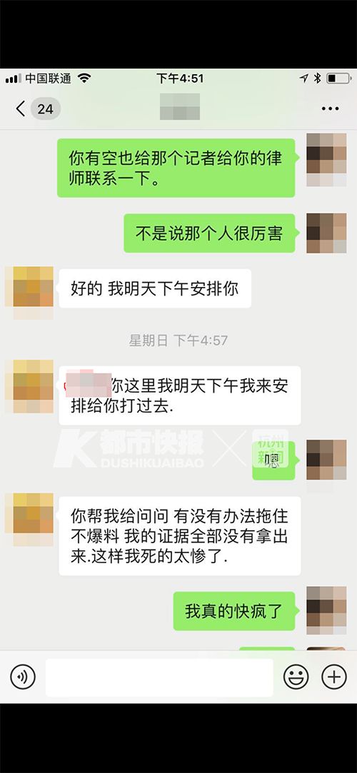林女士正在接受记者采访 她说,2017年5月20日,在北京一个音乐节,她通过小王前男友认识小王,“给我的印象,小王是蛮有钱的,戴着的钻石很大只,但我不知道真假。去年7月,我出差路过武汉,她开了辆保时捷卡宴来接我,还给我在五星级酒店开了房间。” “她和小毛的事情,我是知道一些的,就是她找我帮忙,找电视台来曝光的。”林女士向记者出示了她和小王的聊天记录,内容关于找电视台曝光的,“我当时建议她先找律师咨询下,她还找我帮忙,说想让这件事情上热搜,我听了吓了一跳,这得花多少钱,直接告诉她不可能。”