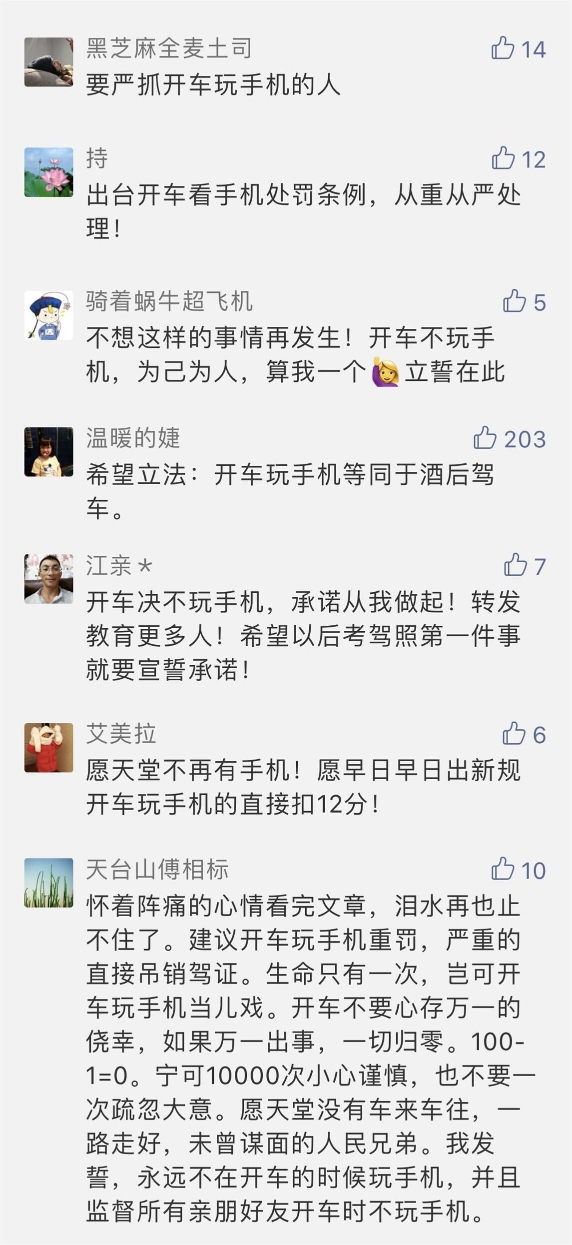这个悲剧勾起了网友“李李”痛苦的回忆,她留言道:“看到我就难过。我的爸爸也是这样子走了。”我们无法想象,在屏幕的那一段,这位姑娘是用如何的心情一字一句打下这样的叩问:“你们开车为何不专注?” 网友“旷野的风”回顾日常生活说道:“开车玩手机的情况越来越严重。”网友“Jessie”坦诚反思:“我再也不在开车的时候看手机了。” 近年来,由于司机开车看手机这项陋习引发的事故绝不是少数。司机7分钟看39次手机撞死老汉、南京女司机因看微信撞翻车、男子开车看股票撞上护栏.....这类触目惊心的新闻标题屡见报端。 网友“光武中兴”说道:“你拿的不是手机是手雷。现在看看,有多少鲜活的生命因为一部小小的手机而陨落,是时候放下手机了。” 记者查阅资料得知,司机低头看一眼手机,至少要用时3秒以上。按照车辆时速60公里计算,3秒钟时间内车辆已经行驶了50米。也就是说,这50米内司机完全处于盲驾状态,给自己和他人都带来危险。与此同时,玩手机时司机无法用双手把控方向盘,一旦出现危险,司机的个人反应能力和应急处置能力都会严重受限。 处罚手段亟需加强 网友呼吁与酒驾一样入刑 逝者已矣,在悲痛的同时我们是否应该引以为戒,让此类悲剧不再发生? 有不少网友指出,中国目前对于开车打手机的处罚力度太轻了。按照我国《道路交通安全法实施条例》和《机动车驾驶证申领和使用规定》,有拨打、接听手持电话等妨碍安全驾驶行为的,处以200元罚款并记2分。 留言区,许多网友主动承诺“开车不玩手机,从我做起”,并且大部分网友都提出应修订法律、升级管理手段,加大对开车玩手机的处罚力度。甚至有网友提出,将其与酒驾违法行为一样入刑,按照危险驾驶定罪。 网友“江亲”认为可以在考取驾照时就应加强教育:“希望以后考驾照第一件事就是要宣誓承诺(开车不玩手机)。”网友“骑着蜗牛超飞机”则在留言区主动承诺:“开车不玩手机,为己为人,算我一个,立誓在此。” 网友“温暖的婕”直言:“希望立法,开车玩手机等同于酒后驾车。” 网友“天台山傅相标”说道:“建议开车玩手机重罚,严重的直接吊销驾照。生命只有一次,岂可开车玩手机当儿戏。”