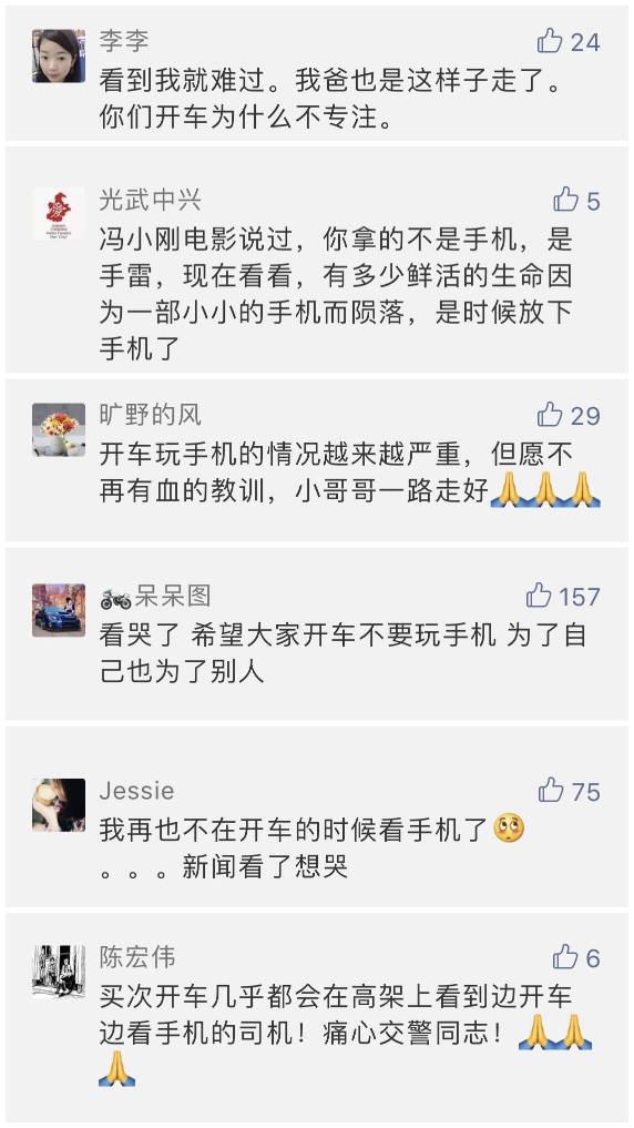 这个悲剧勾起了网友“李李”痛苦的回忆,她留言道:“看到我就难过。我的爸爸也是这样子走了。”我们无法想象,在屏幕的那一段,这位姑娘是用如何的心情一字一句打下这样的叩问:“你们开车为何不专注?” 网友“旷野的风”回顾日常生活说道:“开车玩手机的情况越来越严重。”网友“Jessie”坦诚反思:“我再也不在开车的时候看手机了。” 近年来,由于司机开车看手机这项陋习引发的事故绝不是少数。司机7分钟看39次手机撞死老汉、南京女司机因看微信撞翻车、男子开车看股票撞上护栏.....这类触目惊心的新闻标题屡见报端。 网友“光武中兴”说道:“你拿的不是手机是手雷。现在看看,有多少鲜活的生命因为一部小小的手机而陨落,是时候放下手机了。” 记者查阅资料得知,司机低头看一眼手机,至少要用时3秒以上。按照车辆时速60公里计算,3秒钟时间内车辆已经行驶了50米。也就是说,这50米内司机完全处于盲驾状态,给自己和他人都带来危险。与此同时,玩手机时司机无法用双手把控方向盘,一旦出现危险,司机的个人反应能力和应急处置能力都会严重受限。 |