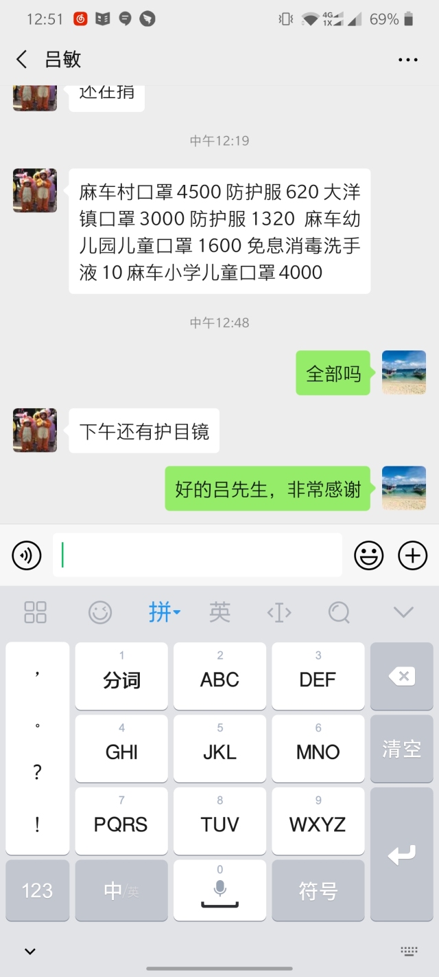 吕敏给村民送物资,并不只这些,记者不完全的统计了一下,他已经免费给大洋镇和梅城镇送上一次性防护服3000套、口罩13500个、防护眼镜150个、免洗消毒洗手液10瓶,而现在,他又在各处寻找物资资源,积极送到各个一线工作人员手中。