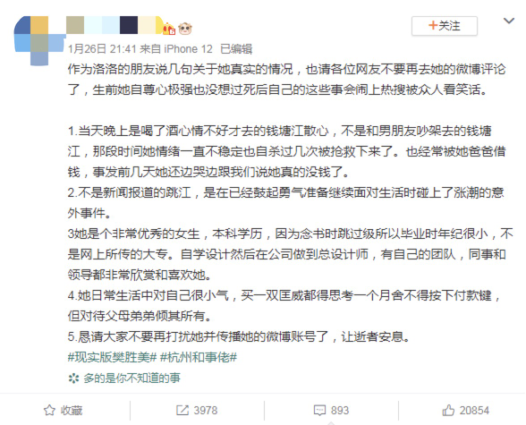 昨晚,微博上一位疑似洛洛朋友的微博账号发布微博称:“让逝者安息...”