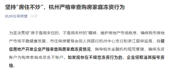 “买房代冻资”事件持续发酵,杭州市住保房管局最新回应,市住保房管局会同人民银行杭州中心支行和浙江银保监局,将督促房地产开发企业严格审查购房家庭冻资情况,指导相关金融机构规范管理,确保冻资账户为购房家庭成员名下账户。如发现存在不规范冻资行为的,企业将取消其摇号资格。