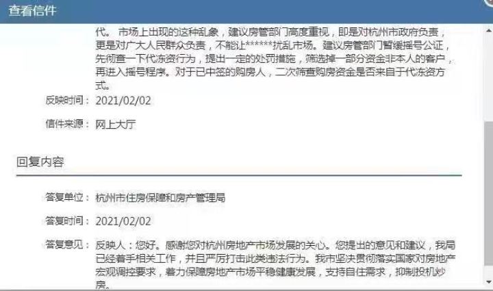 对此,杭州市住房保障和房产管理局回复,已经着手相关工作,并且严厉打击此类违法行为。杭州市坚决贯彻国家对房地产宏观调控要求,着力保障房地产平稳健康发展,支持自住需求,抑制投机炒房。