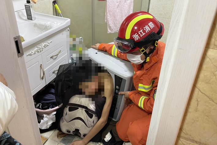 12岁男孩卡进洗衣机里动弹不得