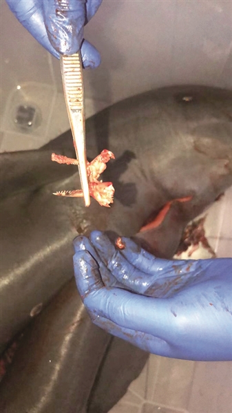 邵庆均教授是主刀解剖者,他认为:江豚咽喉里卡着的汪刺鱼可能是致死最主要的原因。“我当时从它嘴巴里一拉,发现有条鱼尾巴,再拉,拉不出来了。最后用镊子取出来,发现卡在江豚咽喉处的是汪刺鱼头骨和骨状鱼鳍。”江豚有三个胃,在它的第一个胃里,发现了大量活的线虫成虫,又在肠道后段发现了数量超多的类似于牛羊的绦虫。“寄生虫的数量超乎想象!”邵教授惊叹,“很有可能引发多种症状。”“这头江豚比较清瘦,解剖时发现皮下脂肪比较少。”邵教授说。鱼骨头卡在了咽喉处,可能导致江豚无法进食、呼吸受限。这样,时间久了它可能出现体弱无力现象,并会浮出水面。如果到浅水的地方来就容易被波浪冲上岸而搁浅,导致死亡。记者也从邵教授这里了解到,2月9日死亡的江豚“壹壹”(取名壹壹,是因为它是2011年在钱塘江里发现的第一头江豚),肚子鼓鼓的,脂肪很厚,第一个胃里充满捕食到的鱼类,证明它精力旺盛,患有慢性疾病的可能性很小。专家组推测“壹壹”死亡的第一原因是追逐鱼的时候不小心搁浅。第二个可能是它在追逐鱼时把自己的眼睛戳中了,并戳伤了脑等组织,引起死亡,也许还有其他原因。