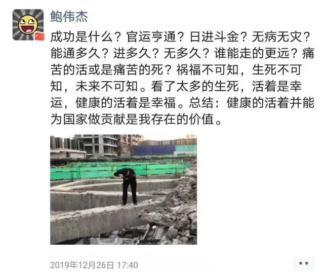 陪护的同事说,前两天,鲍伟杰清醒过一会儿,视频里他插着管,睁着眼睛,流了眼泪。鲍伟杰成了新闻里的人,很多人被他朋友圈那句“健康的活着并能为国家做贡献是我存在的价值”怦然打动。