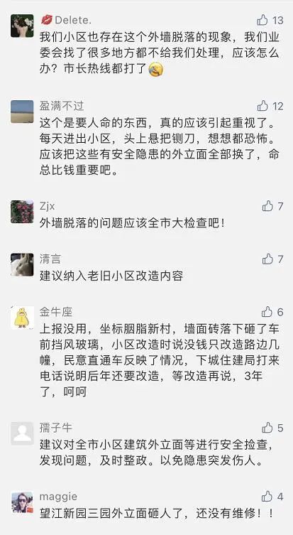 小陈2017年和老公在小区买的房,2019年入住,她说自己住的12幢外立面也有翘起现象,业主群里不少人吐槽抱怨,“我们还是新小区呢,房屋保修期都还没过,外立面就噼里啪啦掉,楼道里的天花板也有脱落的……”