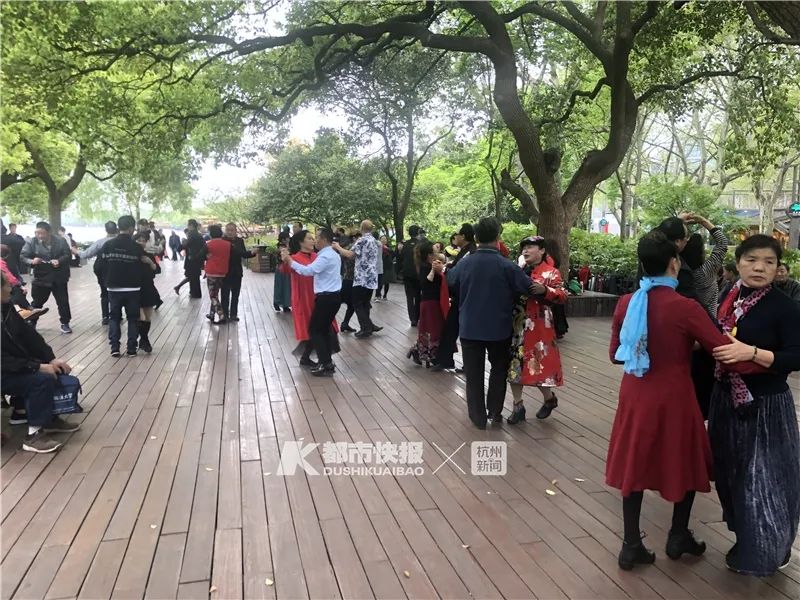 昨天是小长假第一天,从一公园沿南山路往断桥方向,游客很多,西湖边上很热闹,走一段路就能看到“圈地自萌”跳舞的大伯大妈,两两成对,跳完“并舞”,又跳伦巴,唱越剧区域的观众也多,无论是跳的,还是看的,都兴致勃勃。