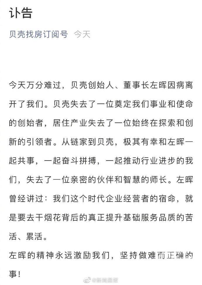 今天万分难过,贝壳创始人、董事长左晖因病离开了我们。贝壳失去了一位奠定我们事业和使命的创始者,居住产业失去了一位始终在探索和创新的引领者。从链家到贝壳,极其有幸和左晖一起共事,一起奋斗拼搏,一起推动行业进步的我们,失去了一位亲密的伙伴和智慧的师长。左晖曾经讲过:我们这个时代企业经营者的宿命,就是要去干烟花背后的真正提升基础服务品质的苦活、累活。