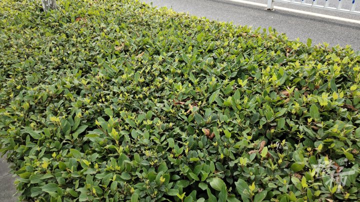 根据李先生的描述,在他家附近,总共有四处绿化带种植了这种灌木。当天下午,“民意直通车”记者来到了下城区杭玻街与会林路的交叉口。 在路口西南角的人行道上,有一长条修剪得整整齐齐的灌木绿化带,长度约为20米,高度在40~50公分左右。
