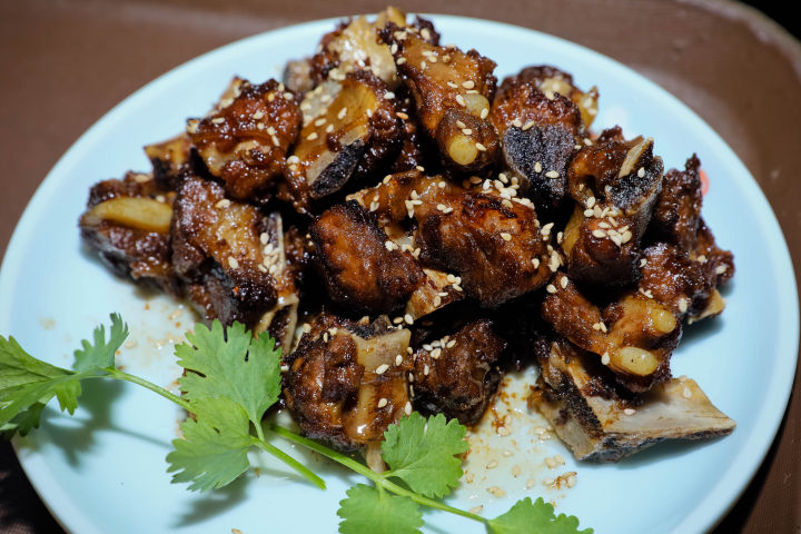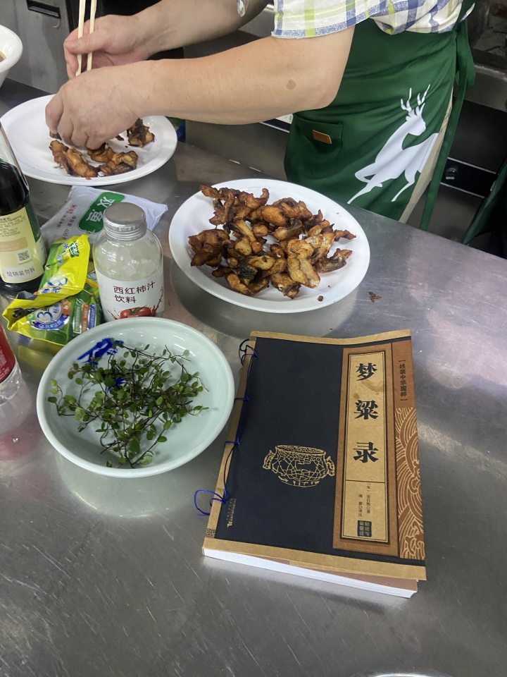 1号选手李云祥的无骨卤鱼。看,李大伯连《武功秘籍》都带来了!他说这道菜的灵感就是从这里来的,烹饪过程也有点复杂,整条草鱼要完全去骨,现炸一次,再复炸一次,然后浸到调好的秘制卤汁里。李大伯说他还根据现在年轻人的口味,稍微改良了下,“加了柠檬汁”,口感酸甜咸香。我也跟着评审团吃了块,确实挺好吃的!