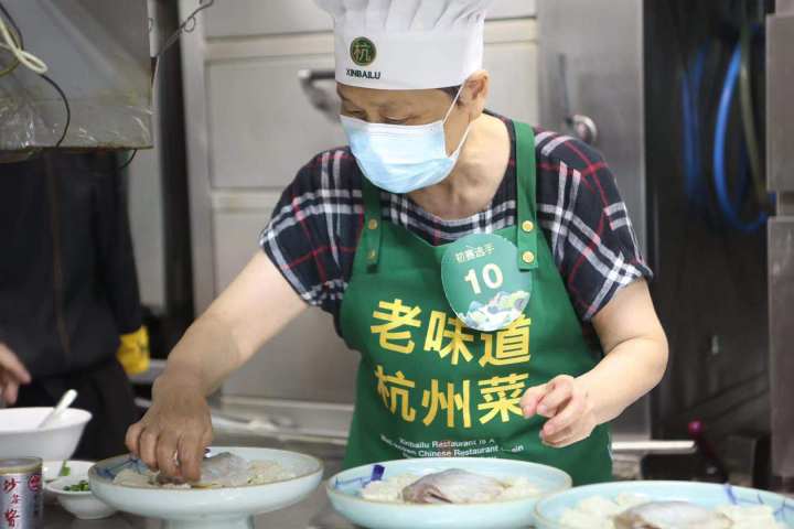“昨天一早5点多,我特地跑去茅廊巷菜场找相熟了20多年的摊主,订了这批臭豆腐。”获得上半场最高分的董大姐,在后厨一边摆盘,一边跟我聊了几句。今年71岁的她,说起杭州菜来头头是道,在董大姐眼里,好的食材比烹饪过程更重要。“烧了快一辈子菜了,以前烧给孩子吃,现在我每天主要负责90多岁的老妈一日三餐。她是我的吃客,每天都要请她老人家提意见的!”