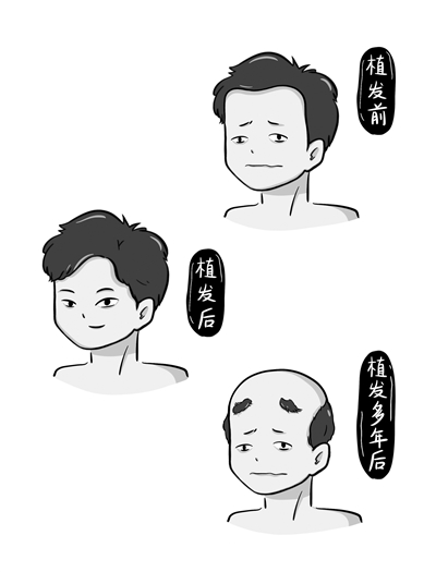 与此同时,防脱发的药物仍要终身服用,否则非植发区头发完全脱落后,将会出现额头有两个“犄角”或头顶“荷包蛋”的尴尬状况。