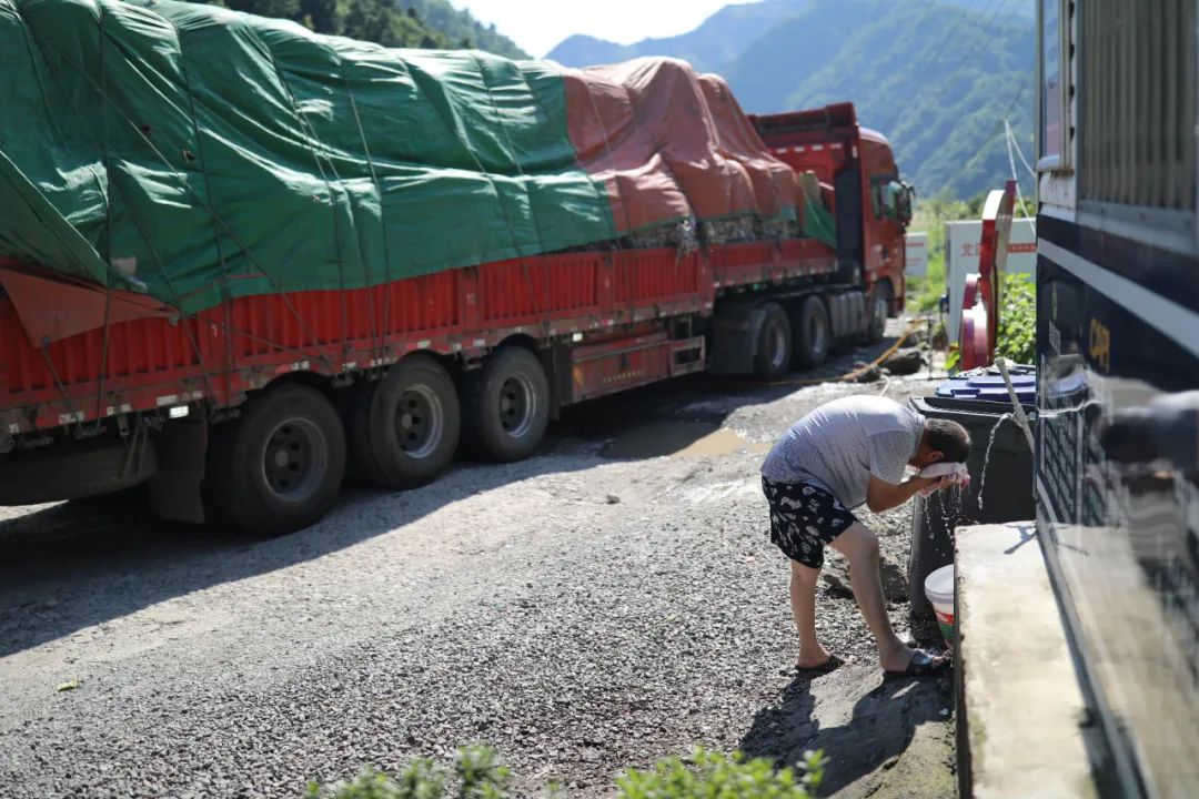 7月19日下午3点刚过,货车流量高峰就来了,到劝导站前排队加水的重型货车明显多了。陕西籍司机老张跳下车,趁着给车子加水,拿了块毛巾,给自己也冲了个澡。驾驶室里,一个电饭煲、两副碗筷、一床被子,老张的妻子正坐在副驾驶座上打着瞌睡。